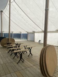 - Démonter les tables (les pieds et le plateau) et les poser au milieu du chapiteau (voir photo ci-dessous)