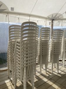 - Enlever les housses de chaise et faire un tas au milieu du chapiteau (ne pas les laisser sur les côtés en cas de pluie)