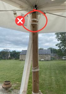 - les côtés du chapiteau peuvent être enroulés s’il fait trop chaud ou que vous souhaitez profiter du soleil. Attention : en ouvrant les bâches, ne pas défaire la sangle tout en haut (voir photos)