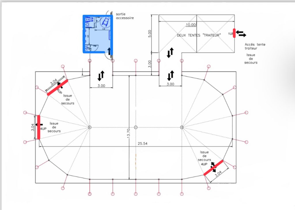 Le chapiteau mesure 325m² et 50m² d’espace traiteur. Il est accessible principalement par le coin Sud Ouest.